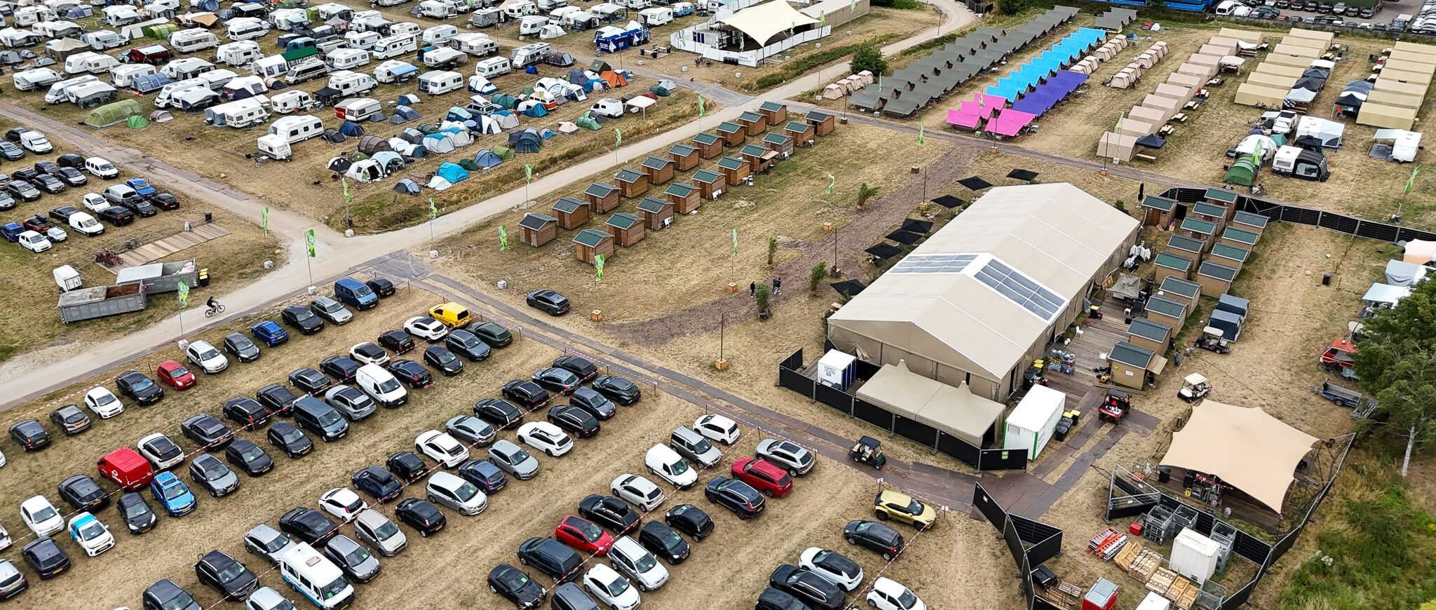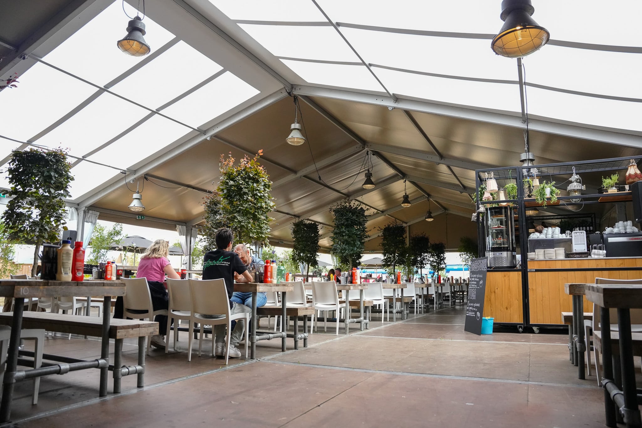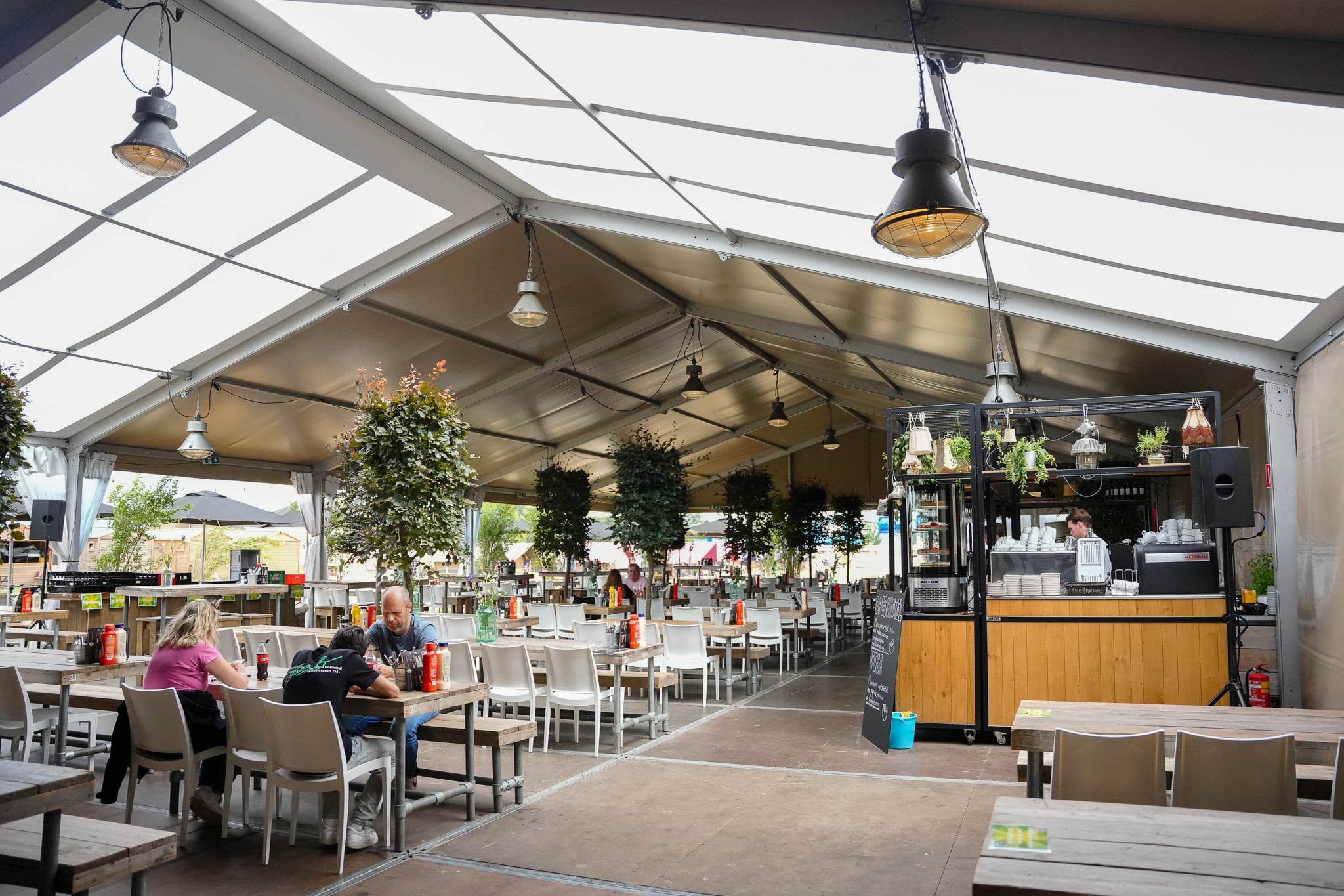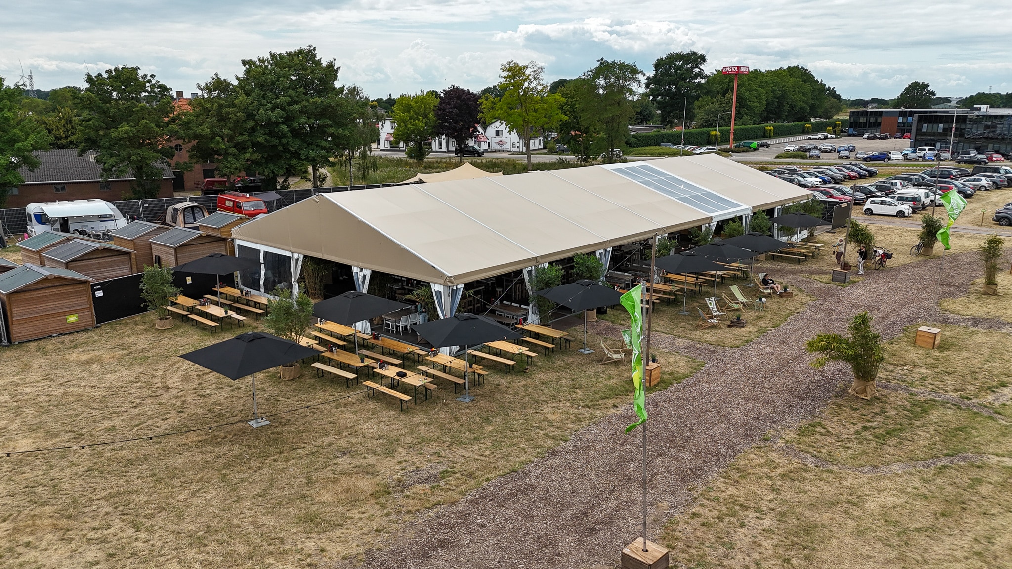 Tijdens de Nijmeegse Vierdaagse stonden onze aluhallen op de camping en werd ingericht als restaurant en massagetent. De warme uitstraling sloot mooi aan bij de omgeving en bood een comfortabele plek waar bezoekers konden genieten van hun maaltijden en massages. Functioneel én sfeervol, precies wat nodig is bij een evenement van deze omvang.
